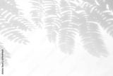 Gray shadow of delicate acacia leaves on a white wall. Abstract neutral nature concept background. Space for text.
