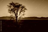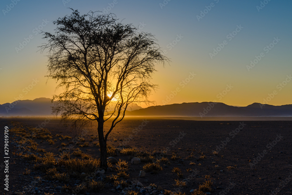 Sunrise over the Namib desert, with trees silhouetted in the distance, Namibia