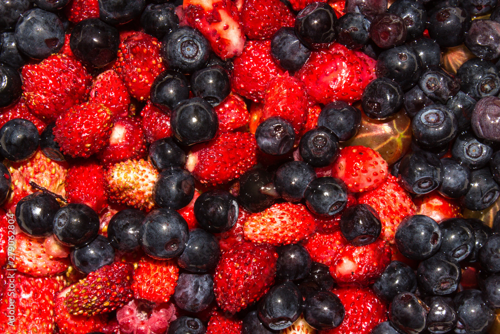 Blueberries and strawberries top view.Background of berries.A mixture of blueberries and strawberries.