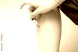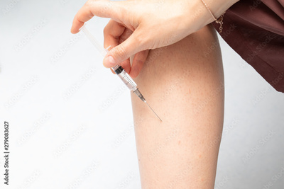 A young Caucasian woman is viewed closeup, inserting a hypodermic needle into her leg. Rapid delivery of drugs into the body to treat ailments such as diabetes.