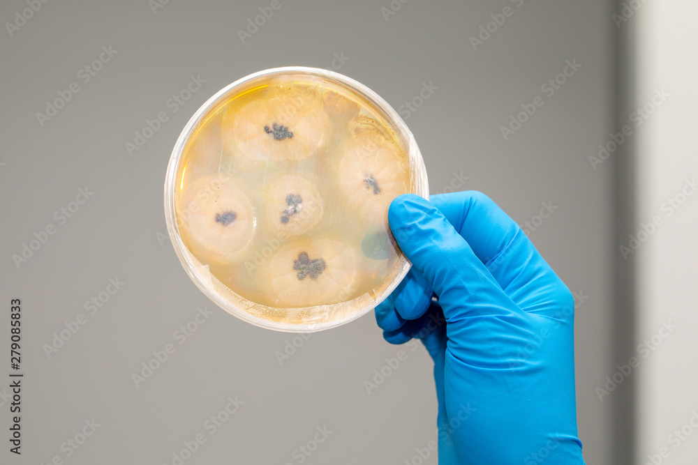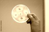 A lab technician holds an agar dish up against a grey surface to inspect the cultivated organisms during a scientific research experiment.