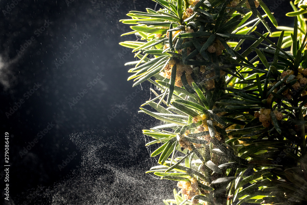 A close up view of water mist form an irrigation system in the garden. Watering plants during spring with sunlight reflecting from fine water drops.