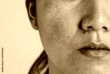 Woman with problematic skin and acne scars. Problem skincare and health concept. Wrinkles melasma Dark spots freckles dry skin and pigmentation on face asian woman.