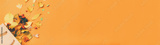 Fall season new collection. Cropped shot of yellow leaves scattered from shopping bag over orange background. Copy space.