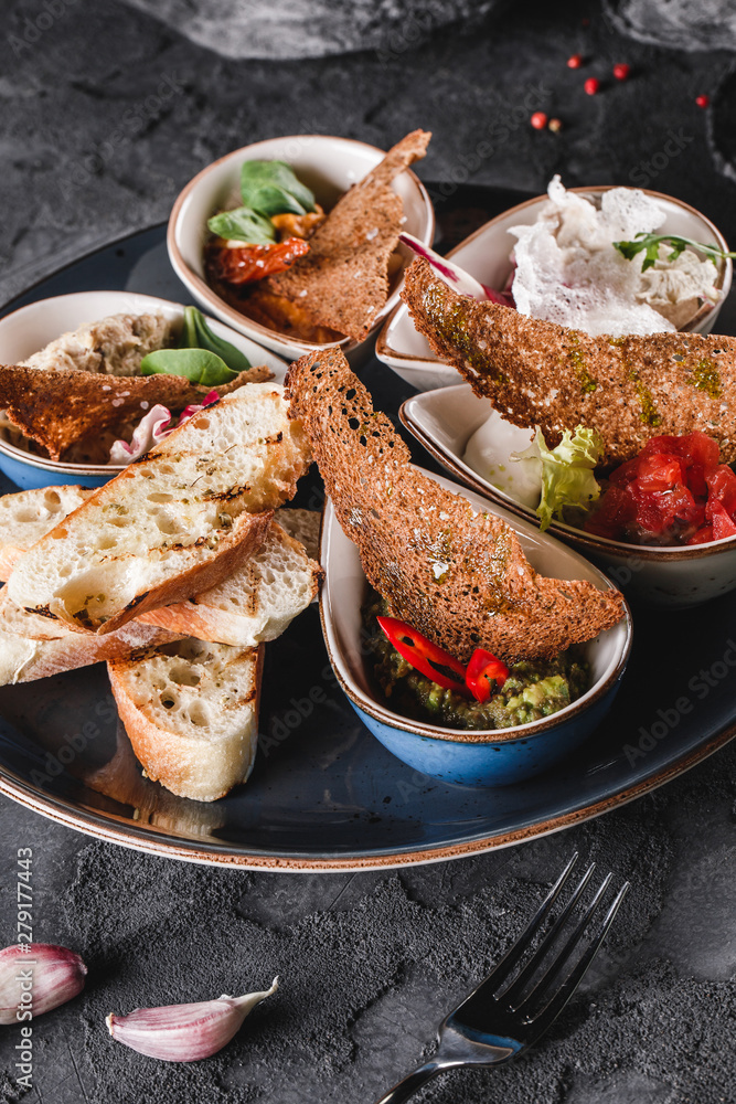 Healthy appetizer or snack with hummus, cod liver with ricotta, guacamole, rabbit sirloin, eggplant caviar in bowls over grey background. Healthy food, clean eating, dieting, top view