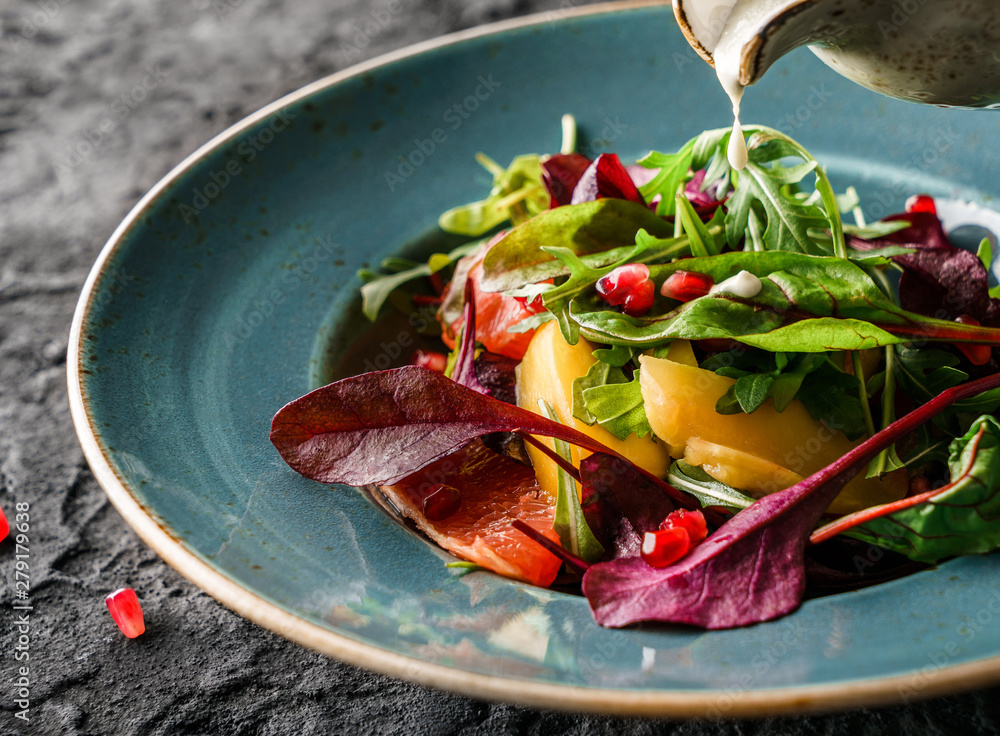Healthy fresh fruit salad with greens and sauce in bowl over dark background. Healthy food, vegetarian dieting, close up