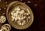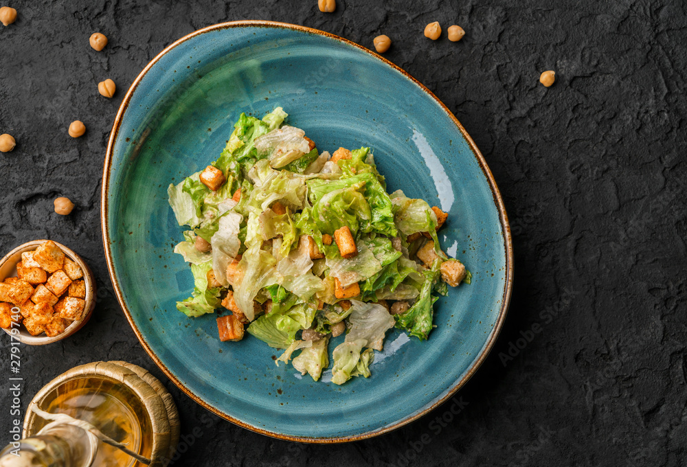 Healthy caesar salad with chickpeas, crackers, lettuce, cheese sauce in ceramic plate over dark background. Healthy food, vegetarian dieting, top view