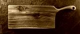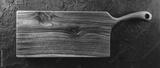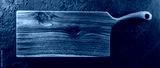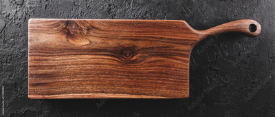 Chopping cutting board on dark stone background. Wooden texture. Top view, toning