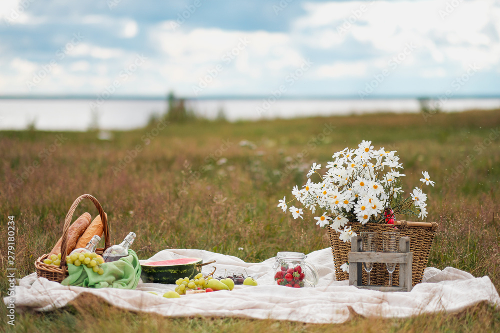 Summer picnic in the meadow on the green grass. Fruit basket, juice and bottled wine, watermelon and bread baguettes. White tablecloth and a bouquet of field daisies.