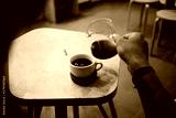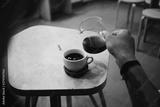 Cinematic vintage photo behind shoulder of man with arm tattoos pour filter coffee from glass jar into cup at specialty coffee shop or cafe. fancy caffeine drink addiction and millennial trend