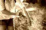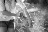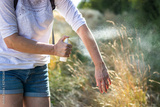 Insect repellent. Woman applying mosquito repellent on hand in nature. Skin protection against tick and other insect