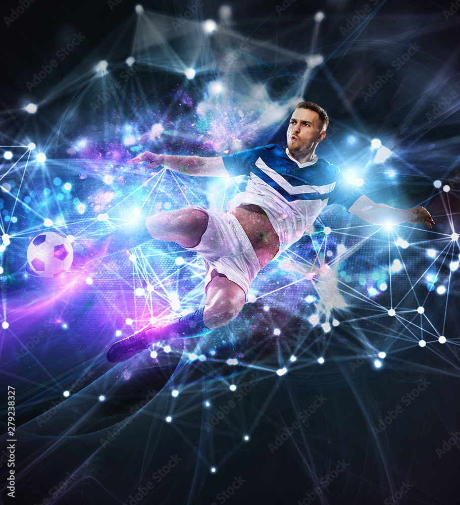 Football scene with soccer player in front of a futuristic digital background
