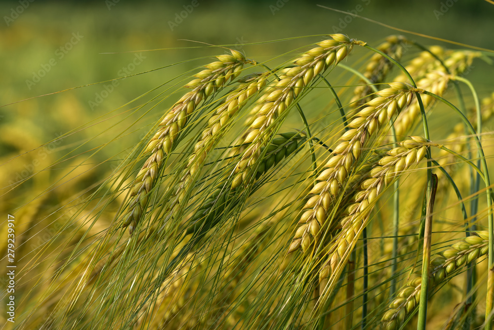 Closeup of fresh cereal ears on the field in the evening sun