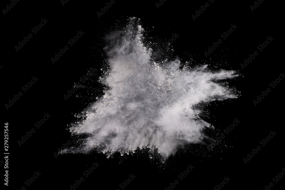 White powder explosion on black background. Colored cloud. Colorful dust explode. Paint Holi.
