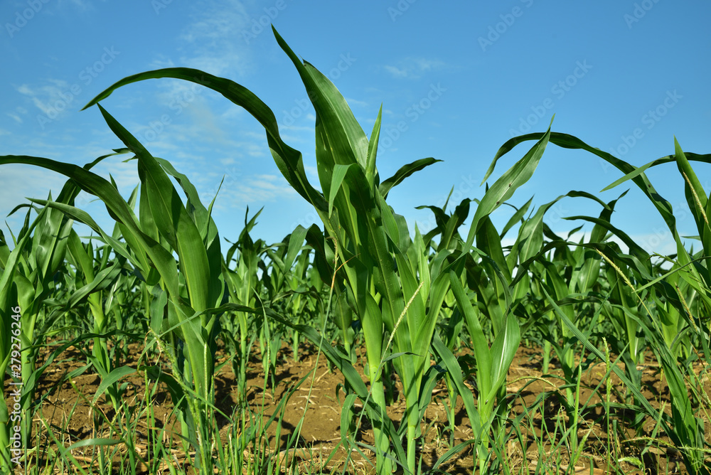 A young corn field with young green corn plants in the evening in Germany with sunlight