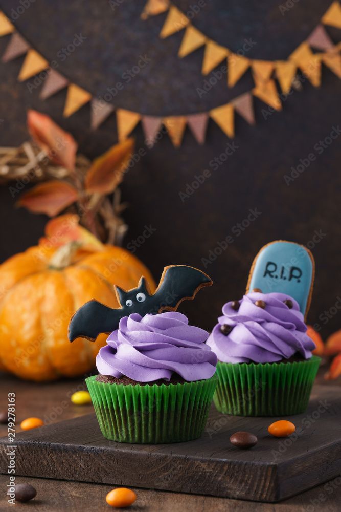Bat and tombstone gingerbread cookies as cupcake decorations.