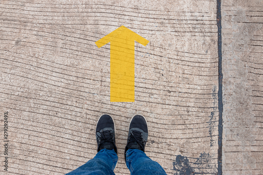 Person wearing sneakers standing on a concrete road with yellow arrows, Decision-making concept