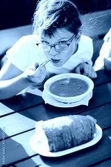 little girl in glasses eating hot soup