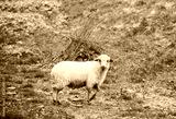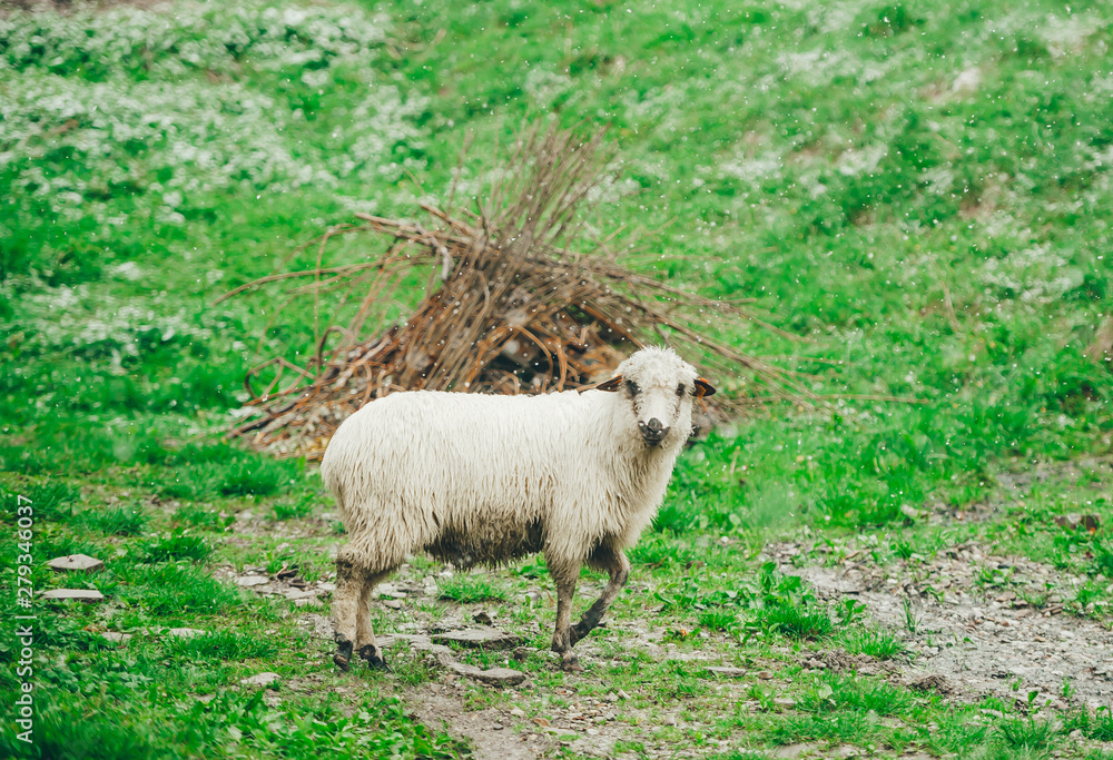 Sheep looking at camera on the green meadow in cloudy snowy day