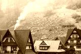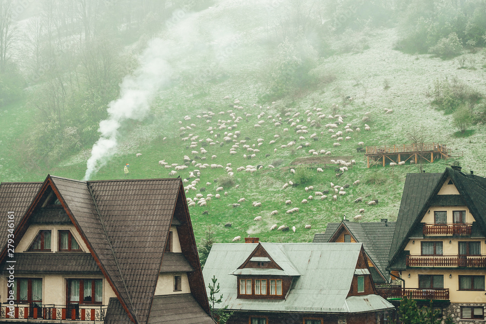 A herd of grazing sheep on distance in the Zakopane mountain village on a cloudy day. Poland.