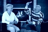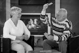 Retired couple playing cards in front of fireplace