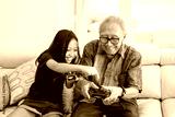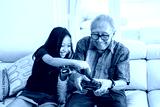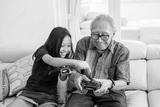 Happy girl and her grandfather play video games