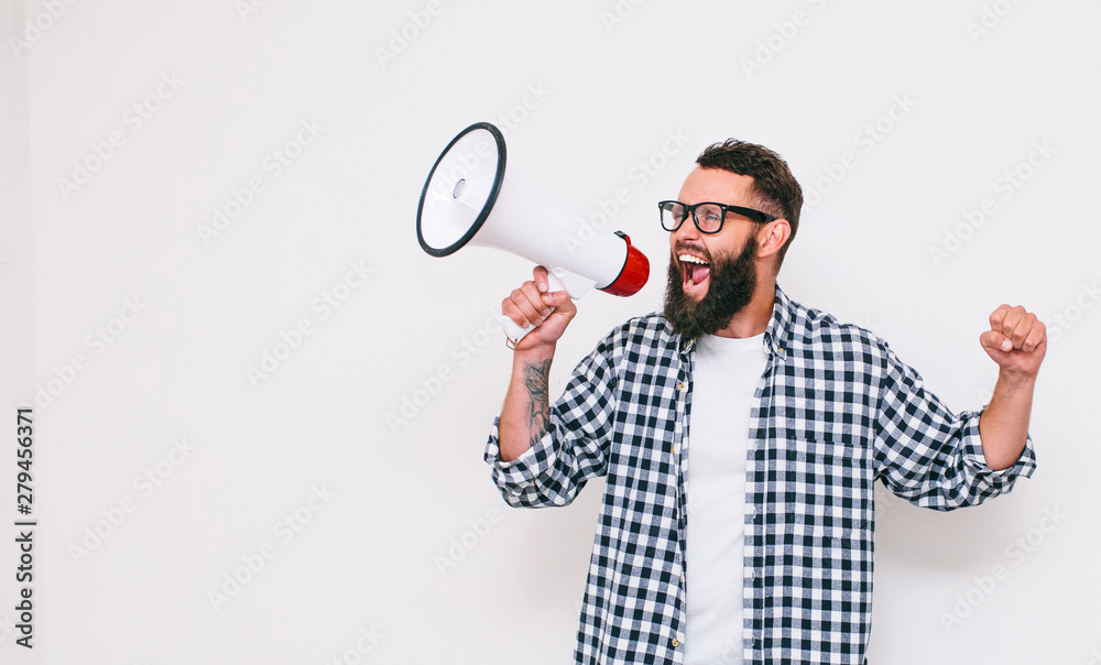 Fashion portrait of emotional hipster man with megaphone on white background in stylish sunglasses. Sales man using megaphone yelling