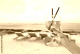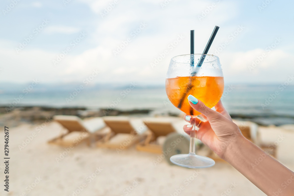 Woman holding Delicious classic iced aperol spritz cocktail with ice cubes on a hot tropical beach in summer sunshine