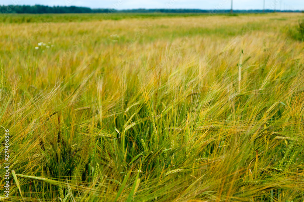 Field of green ripe rye closeup