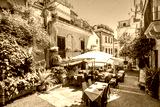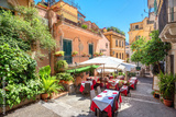 Street view with cafe in old town Taormina. Sicily, Italy