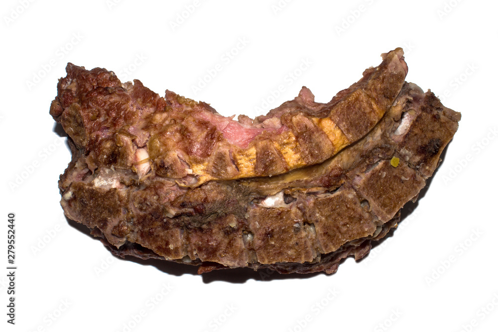 Smoked bone with meat on white background.Bone smoked for pea soup.