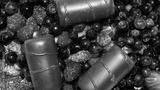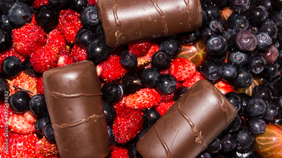 Wild berries with chocolates.Background of blueberries,strawberries and candy.