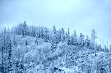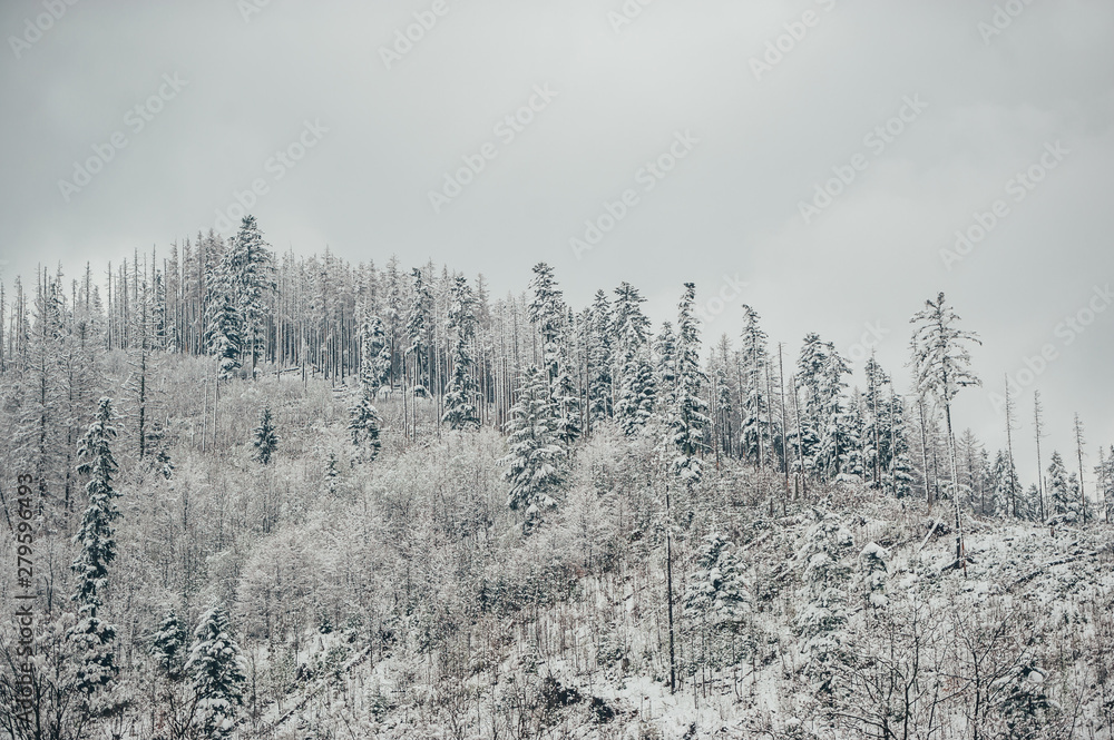 Winter landscape, snow-capped Tatra mountains, snow-covered forest.