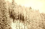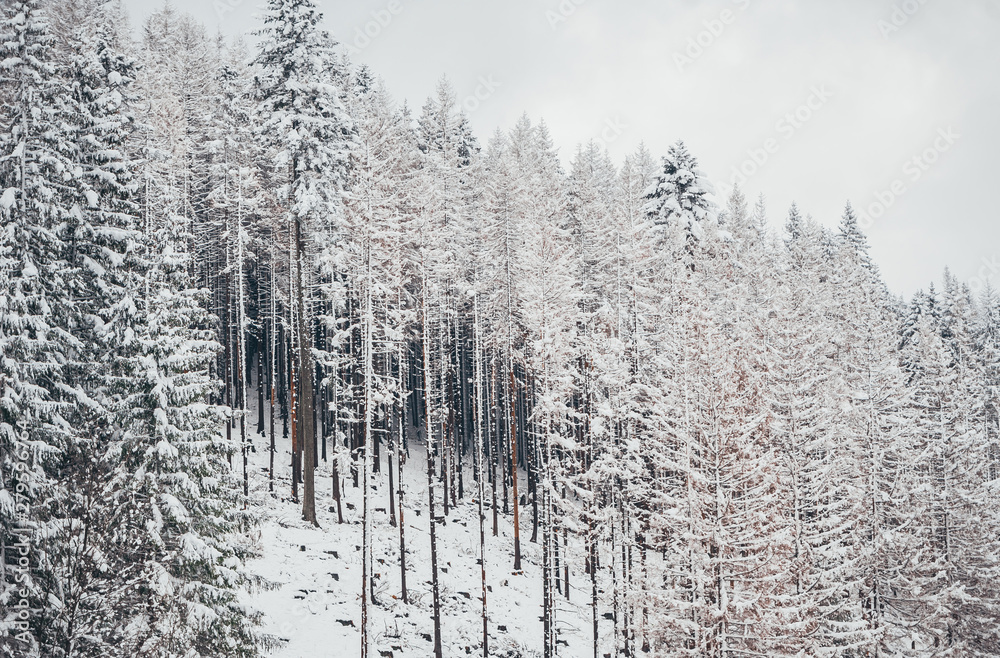 Tall spruce trees covered with snow in winter forest and cloudy sky background.