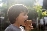 Fresh porcini mushroom in child hand. Happy boy hold big cep mushroom