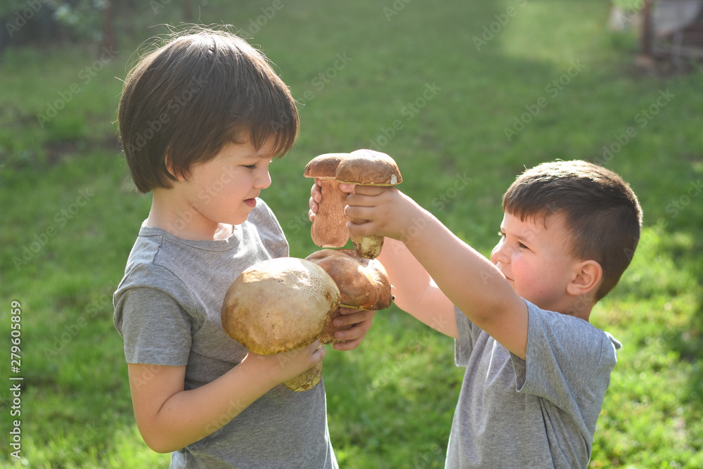 Two children holding fresh mushroom boletus edulis. Happy boys holding big cep mushrooms