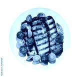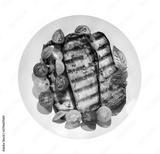 plate of grilled eggplants with tomatoes and green basil isolated on white background