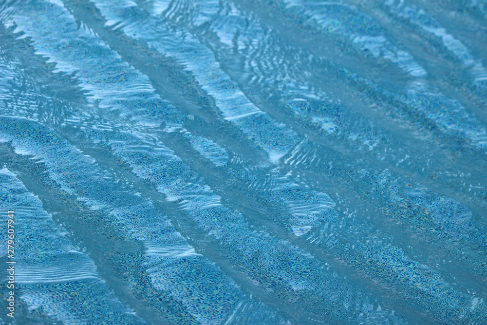 Abstract turquoise swimming pool textured background with bands of contrasting diagonal waves formed from wind and sunlight reflecting on the water's surface