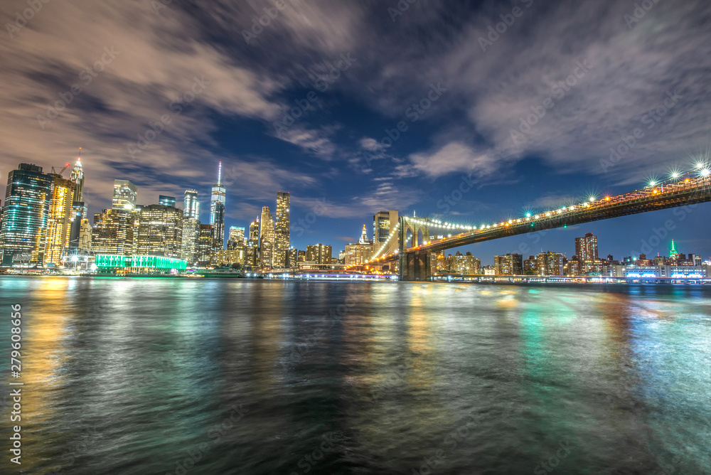 Skyline of Manhattan and Brooklyn bridge, night view