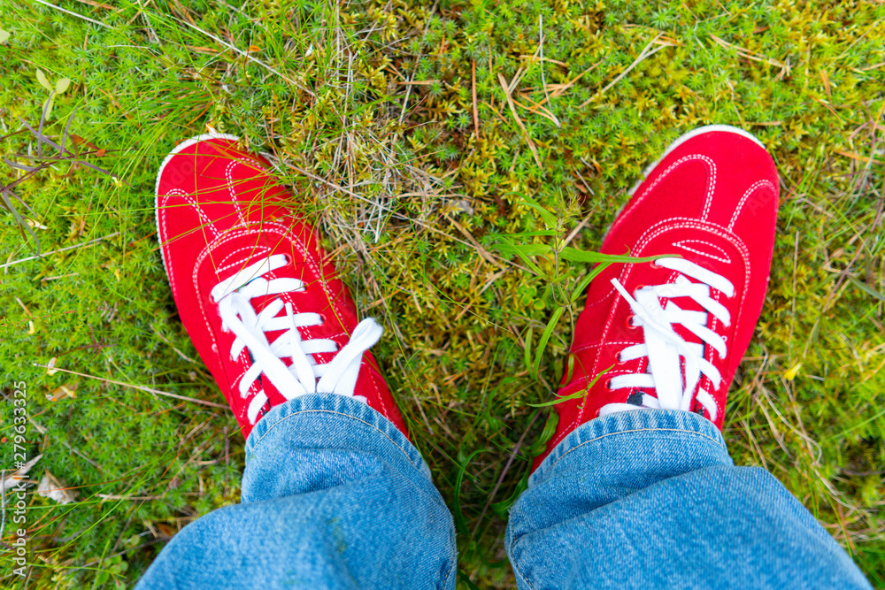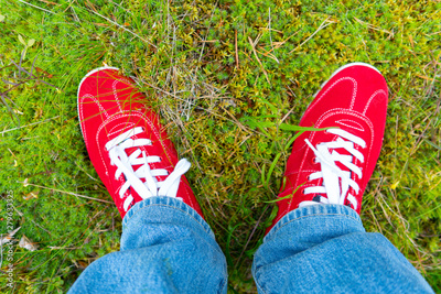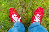 Red sneakers with white laces. Blue jeans.