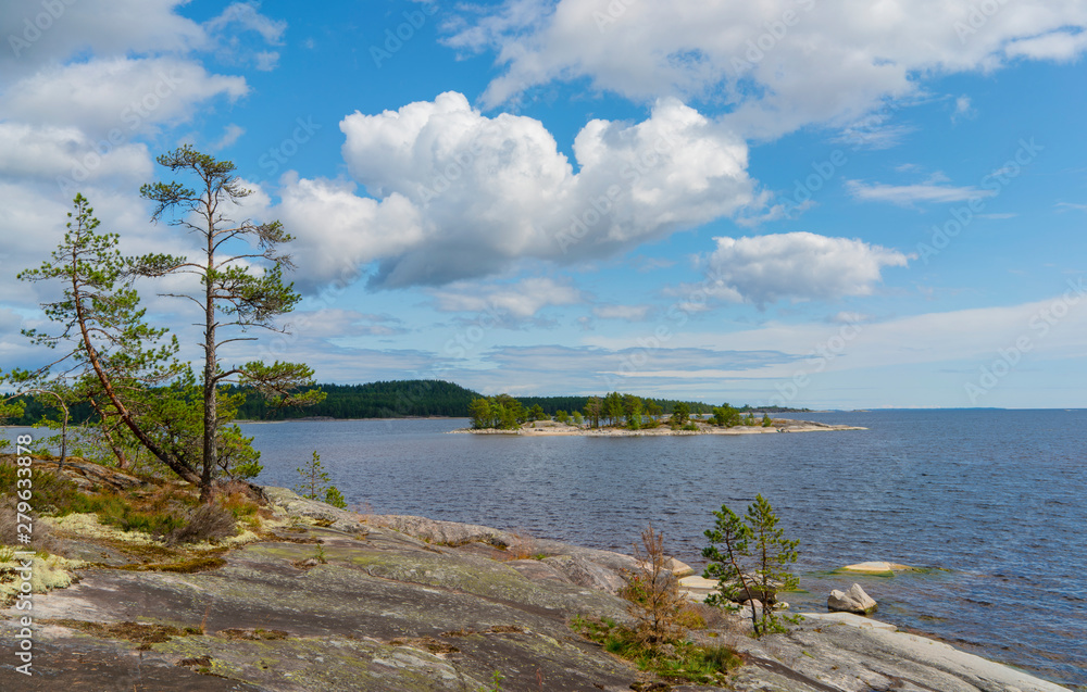 Islands in Lake Ladoga. Beautiful landscape - water, pines and boulders.