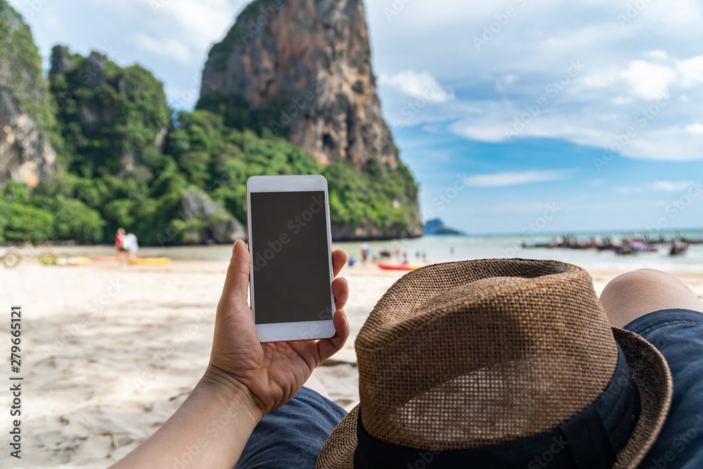 Young man traveler using smartphone at tropical sand beach, Summer vacation concept
