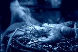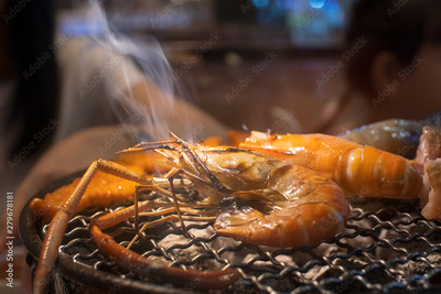 Hot Grill shrimps on the grilling basket and charcoal stove with smoke at the restaurant