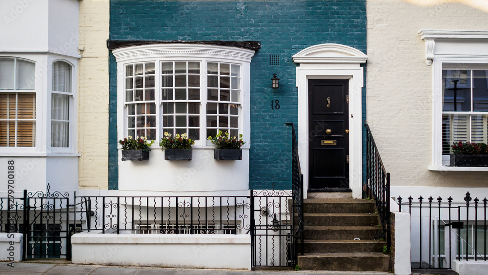 Coloured painted house terraces in London, 2017. Squared format.