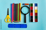 Magnifying glass, pencils, ruler, sheath, watercolor on a blue paper background with space for text. Set of school supplies.