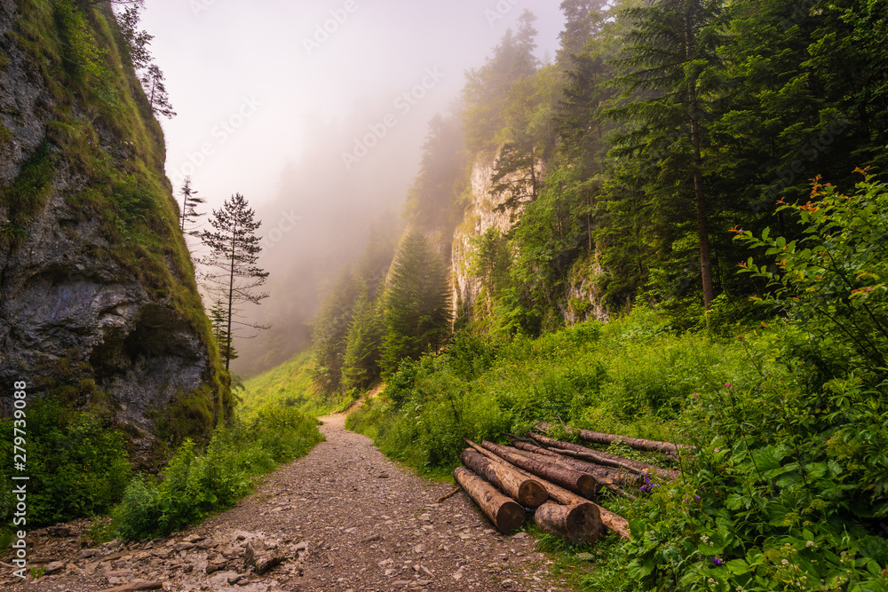 hiking trail in the mountains leading through the gorge on a foggy morning-The Szopczański gorge (Przełęcz Szopka),Pieniny,Poland