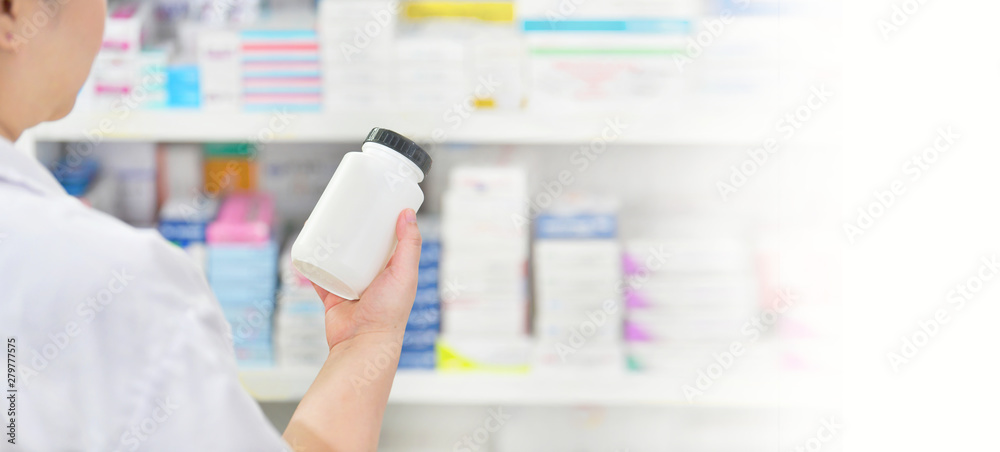 Pharmacist holding medicine bottle at the pharmacy drugstore,copy space