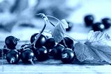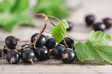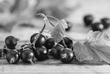 Ripe black currant with leaves on an old wooden surface. Berries in summer. Close-up, copy space.