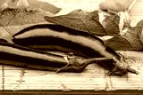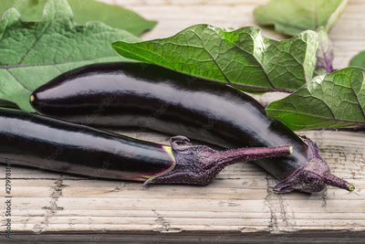 Young, organic eggplants with leaves on an old wooden surface. Close-up, copy space.