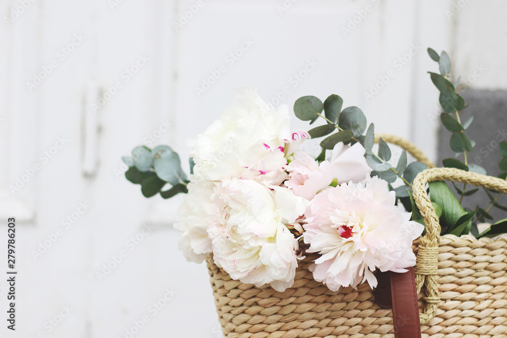 Feminine wedding still life composition. Straw French basket bag with pink peonies flowers and eucalyptus bouquet. Old white door in the background. Styled stock photo. Selective focus.